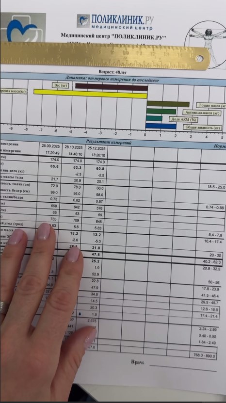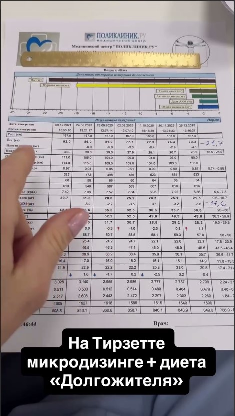 комментарии к видео: Девушка 48 лет. Похудела за 1 год на 21 кг 700 грамм, из них на 17 кг 600 грамм жира. На препарате Тирзетта. Пара тройка месяцев была на диете. Хороший результат. Произошло метаболическое омоложение. Параметры отвечающие за кости и мышцы в норме. было 23.3 осталось 23.7. ушло 600 грам мышц. результат фармо терапии и диеты. медийные материалы: