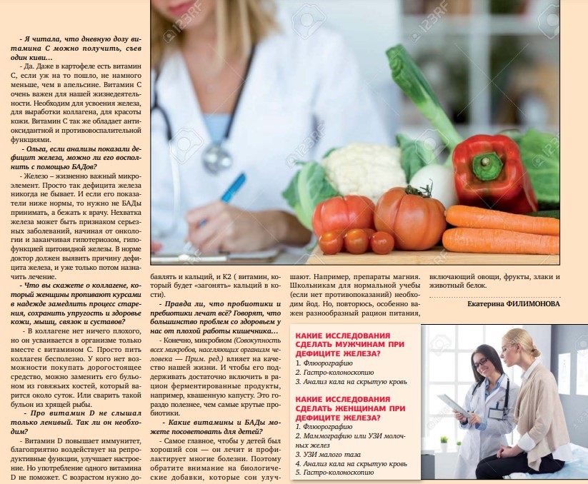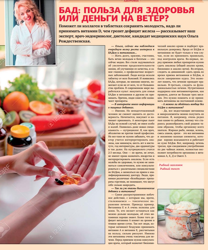 Бад: польза для здоровья или деньги на ветер?Дата: 04.12.2023 Источник: журнал Семь дней Участники: Ольга Рождественская, Екатерина Филимонова Продолжительность: 7:48 вернуться к медиатеке скачать интервью в docx формате скачать интервью в txt формате скачать интервью в pdf формате скачать интервью в mp3 формате ![]() ![]() БАД: польза для здоровья или деньги на ветер? Поможет ли коллаген в таблетках сохранить молодость, надо ли принимать витамин D, чем грозит дефицит железа — рассказывает наш эксперт, врач-эндокринолог, диетолог, кандидат медицинских наук Ольга Рождественская. — Ольга, сейчас мы наблюдаем очередную волну роста интереса к БАДам и витаминам... — Жить долго, красиво, счастливо, быть вечно молодым и богатым — это сейчас модно. Все стали задумываться об увеличении продолжительности жизни, об улучшении ее качества, и самое главное, о профилактике возрастных заболеваний. Люди всегда искали таблетку от всех болезней. И появились БАДы, которые, по мнению многих, помогают если не от всех, то от большинства проблем. В современном мире выработался культ: накупить для семьи БАДов и витаминов и дружно их принимать. Причем, люди сами себе назначают препараты. — В интернете много информации о пищевых добавках. — Именно. Но неподготовленный человек не сможет оценить ее достоверность. Начитается, покупает и начинает принимать. А некоторые пьют БАДы на всякий случай, не имея особо и жалоб. Появилась даже новая специальность — нутрициолог. Я, как врач, абсолютно не против такой профессии. Но все-таки не нужно забывать, что доктор учится интерпретировать анализы, как минимум, шесть лет в институте, год интернатуры, два ординатуры и так далее. На нутрициолога учатся 2-3 месяца. Они — не врачи, не лечат, не имеют права назначать лекарства и интерпретировать анализы. Если есть жалобы по здоровью, то нужно не заниматься самолечением, или консультироваться с различными специалистами по БАДам, а записаться на прием к квалифицированному доктору. Люди, принимая различные «безобидные» препараты горстями, не понимают, что могут себе сильно навредить. — Так ли уж опасны биологические добавки и витамины? — Самое распространенное побочное действие, с которым мы, врачи, сталкиваемся — токсическое поражение печени. Приведу пример. Витамины Е и А очень полезны для кожи. Те, кто желает оставаться как можно дольше молодым, об этих витаминах хорошо знают. Более того дефицит витамина А влияет на зрение в темное время суток. Так вот люди, ко торые начинают бездумно принимать витамин А и витамин Е, рассчитывая на пользу, сильно рискуют. Именно эти витамины очень токсичны для печени. Перед приемом нужна консультация врача, который назначит биохимический анализ крови и подберет правильную дозировку. Вреда от БАДов и витаминов не будет только в том случае, если их принимать правильно, под контролем врача. Во-первых, перед приемом любых препаратов нужно сдать анализы (общий анализ крови, биохимия и анализ мочи). Во-вторых, следить за динамикой: сдать кровь во время приема витаминов и БАДов, и после завершения курса. Это позволит понять, что лечение проходит правильно. В-третьих, следить за функциональностью печени. Нутритивная поддержка или витаминотерапия, как правило, длится не больше трех месяцев. Это нужно помнить и не принимать витамины на постоянной основе. — А можно ли о