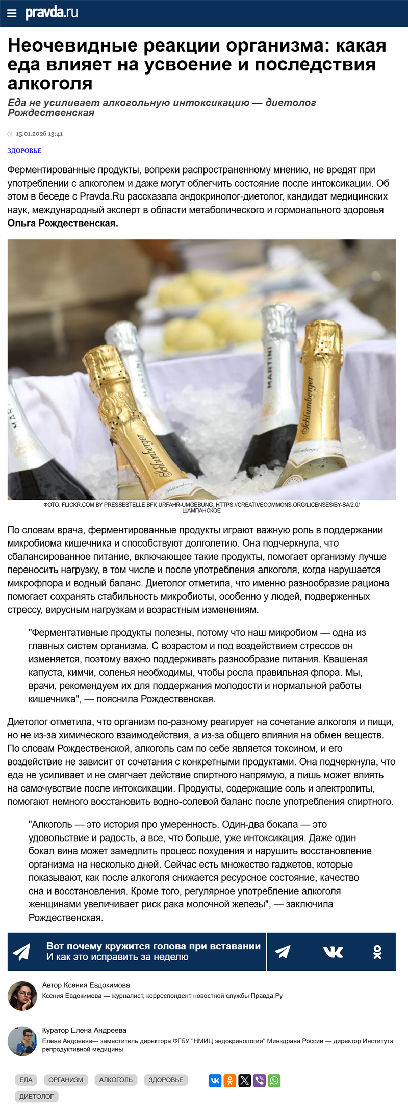 Еда не усиливает алкогольную интоксикацию — диетолог РождественскаяДата: 15.01.2026 Источник: Pravda.ru Участники: Ольга Рождественская, Ксения Евдокимова вернуться к медиатеке скачать интервью в txt формате ![]() Неочевидные реакции организма: какая еда влияет на усвоение и последствия алкоголя Еда не усиливает алкогольную интоксикацию — диетолог Рождественская 15.01.2026 13:41 Ферментированные продукты, вопреки распространенному мнению, не вредят при употреблении с алкоголем и даже могут облегчить состояние после интоксикации. Об этом в беседе с Pravda.Ru рассказала эндокринолог-диетолог, кандидат медицинских наук, международный эксперт в области метаболического и гормонального здоровья Ольга Рождественская. По словам врача, ферментированные продукты играют важную роль в поддержании микробиома кишечника и способствуют долголетию. Она подчеркнула, что сбалансированное питание, включающее такие продукты, помогает организму лучше переносить нагрузку, в том числе и после употребления алкоголя, когда нарушается микрофлора и водный баланс. Диетолог отметила, что именно разнообразие рациона помогает сохранять стабильность микробиоты, особенно у людей, подверженных стрессу, вирусным нагрузкам и возрастным изменениям. "Ферментативные продукты полезны, потому что наш микробиом — одна из главных систем организма. С возрастом и под воздействием стрессов он изменяется, поэтому важно поддерживать разнообразие питания. Квашеная капуста, кимчи, соленья необходимы, чтобы росла правильная флора. Мы, врачи, рекомендуем их для поддержания молодости и нормальной работы кишечника", — пояснила Рождественская. Диетолог отметила, что организм по-разному реагирует на сочетание алкоголя и пищи, но не из-за химического взаимодействия, а из-за общего влияния на обмен веществ. По словам Рождественской, алкоголь сам по себе является токсином, и его воздействие не зависит от сочетания с конкретными продуктами. Она подчеркнула, что еда не усиливает и не смягчает действие спиртного напрямую, а лишь может влиять на самочувствие после интоксикации. Продукты, содержащие соль и электролиты, помогают немного восстановить водно-солевой баланс после употребления спиртного. "Алкоголь — это история про умеренность. Один-два бокала — это удовольствие и радость, а все, что больше, уже интоксикация. Даже один бокал вина может замедлить процесс похудения и нарушить восстановление организма на несколько дней. Сейчас есть множество гаджетов, которые показывают, как после алкоголя снижается ресурсное состояние, качество сна и восстановления. Кроме того, регулярное употребление алкоголя женщинами увеличивает риск рака молочной железы", — заключила Рождественская. Источник: https://www.pravda.ru/news/health/2329346-alkogol-i-eda/ Ключевые теги материала: алкогольная интоксикация , вирусные нагрузки , водно солевой баланс , возрастные изменения , восстановление организма , гаджеты для отслеживания восстановления , долголетие , еда и алкоголь , женщины и алкоголь , замедление процесса похудения , интоксикация , качество сна , микробиом кишечника , микробиота , микрофлора , нарушение восстановления , неочевидные реакции организма , нормальная работа кишечника , обмен веществ , один два бокала , поддержание молодости , последствия алкоголя , разнообразие рациона , регулярное употребление алкоголя , р