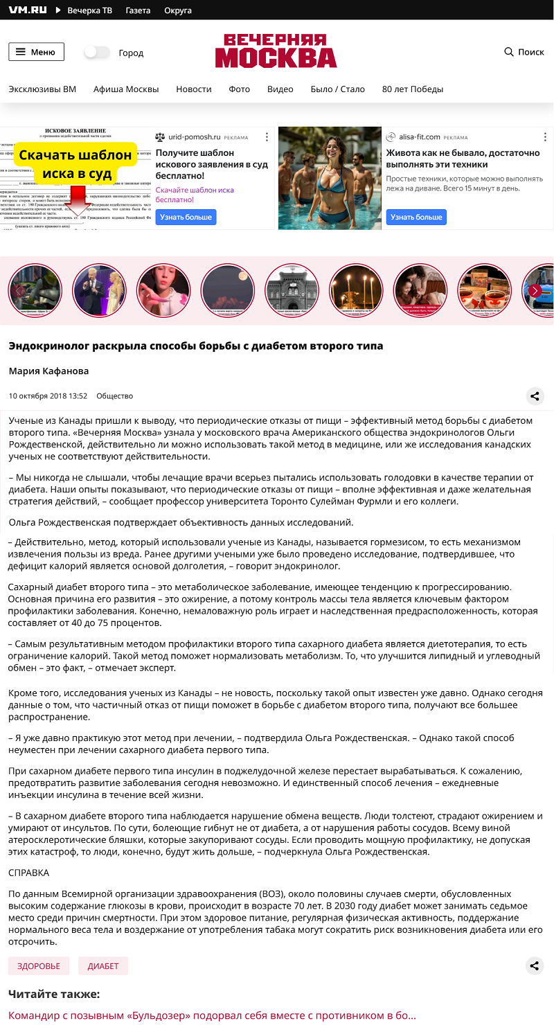 Эндокринолог Рождественская раскрыла способы борьбы с диабетом второго типаДата: 10.10.2018 Источник: Вечерняя Москва Участники: Ольга Рождественская, Мария Кафанова вернуться к медиатеке скачать интервью в txt формате ![]() Ученые из Канады пришли к выводу, что периодические отказы от пищи – эффективный метод борьбы с диабетом второго типа. «Вечерняя Москва» узнала у московского врача Американского общества эндокринологов Ольги Рождественской, действительно ли можно использовать такой метод в медицине, или же исследования канадских ученых не соответствуют действительности. – Мы никогда не слышали, чтобы лечащие врачи всерьез пытались использовать голодовки в качестве терапии от диабета. Наши опыты показывают, что периодические отказы от пищи – вполне эффективная и даже желательная стратегия действий, – сообщает профессор университета Торонто Сулейман Фурмли и его коллеги. Ольга Рождественская подтверждает объективность данных исследований. – Действительно, метод, который использовали ученые из Канады, называется гормезисом, то есть механизмом извлечения пользы из вреда. Ранее другими учеными уже было проведено исследование, подтвердившее, что дефицит калорий является основой долголетия, – говорит эндокринолог. Сахарный диабет второго типа – это метаболическое заболевание, имеющее тенденцию к прогрессированию. Основная причина его развития – это ожирение, а потому контроль массы тела является ключевым фактором профилактики заболевания. Конечно, немаловажную роль играет и наследственная предрасположенность, которая составляет от 40 до 75 процентов. – Самым результативным методом профилактики второго типа сахарного диабета является диетотерапия, то есть ограничение калорий. Такой метод поможет нормализовать метаболизм. То, что улучшится липидный и углеводный обмен – это факт, – отмечает эксперт. Кроме того, исследования ученых из Канады – не новость, поскольку такой опыт известен уже давно. Однако сегодня данные о том, что частичный отказ от пищи поможет в борьбе с диабетом второго типа, получают все большее распространение. – Я уже давно практикую этот метод при лечении, – подтвердила Ольга Рождественская. – Однако такой способ неуместен при лечении сахарного диабета первого типа. При сахарном диабете первого типа инсулин в поджелудочной железе перестает вырабатываться. К сожалению, предотвратить развитие заболевания сегодня невозможно. И единственный способ лечения – ежедневные инъекции инсулина в течение всей жизни. – В сахарном диабете второго типа наблюдается нарушение обмена веществ. Люди толстеют, страдают ожирением и умирают от инсультов. По сути, болеющие гибнут не от диабета, а от нарушения работы сосудов. Всему виной атеросклеротические бляшки, которые закупоривают сосуды. Если проводить мощную профилактику, не допуская этих катастроф, то люди, конечно, будут жить дольше, – подчеркнула Ольга Рождественская. СПРАВКА По данным Всемирной организации здравоохранения (ВОЗ), около половины случаев смерти, обусловленных высоким содержание глюкозы в крови, происходит в возрасте 70 лет. В 2030 году диабет может занимать седьмое место среди причин смертности. При этом здоровое питание, регулярная физическая активность, поддержание нормального веса тела и воздержание от употребления табака могут со