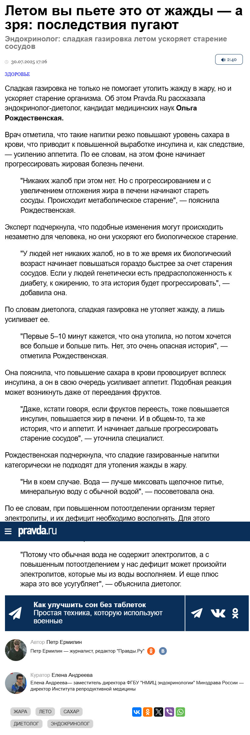 Эндокринолог: сладкая газировка летом ускоряет старение сосудовДата: 30.07.2025 Источник: Pravda.Ru Участники: Петр Ермилин, Ольга Рождественская, Елена Андреева Продолжительность: 2:40 вернуться к медиатеке скачать интервью в txt формате скачать интервью в mp3 формате ![]() Летом вы пьете это от жажды — а зря: последствия пугают Эндокринолог: сладкая газировка летом ускоряет старение сосудов Сладкая газировка не только не помогает утолить жажду в жару, но и ускоряет старение организма. Об этом Pravda.Ru рассказала эндокринолог-диетолог, кандидат медицинских наук Ольга Рождественская. Врач отметила, что такие напитки резко повышают уровень сахара в крови, что приводит к повышенной выработке инсулина и, как следствие, — усилению аппетита. По ее словам, на этом фоне начинает прогрессировать жировая болезнь печени. "Никаких жалоб при этом нет. Но с прогрессированием и с увеличением отложения жира в печени начинают стареть сосуды. Происходит метаболическое старение", — пояснила Рождественская. Эксперт подчеркнула, что подобные изменения могут происходить незаметно для человека, но они ускоряют его биологическое старение. "У людей нет никаких жалоб, но в то же время их биологический возраст начинает повышаться гораздо быстрее за счет старения сосудов. Если у людей генетически есть предрасположенность к диабету, к ожирению, то эта история будет прогрессировать", — добавила она. По словам диетолога, сладкая газировка не утоляет жажду, а лишь усиливает ее. "Первые 5–10 минут кажется, что она утолила, но потом хочется все больше и больше пить. Нет, это очень опасная история", — отметила Рождественская. Она пояснила, что повышение сахара в крови провоцирует всплеск инсулина, а он в свою очередь усиливает аппетит. Подобная реакция может возникнуть даже от переедания фруктов. "Даже, кстати говоря, если фруктов переесть, тоже повышается инсулин, повышается жир в печени. И в общем-то, та же история, что и аппетит. И начинает дальше прогрессировать старение сосудов", — уточнила специалист. Рождественская подчеркнула, что сладкие газированные напитки категорически не подходят для утоления жажды в жару. "Ни в коем случае. Вода — лучше миксовать щелочное питье, минеральную воду с обычной водой", — посоветовала она. По ее словам, при повышенном потоотделении организм теряет электролиты, и их дефицит необходимо восполнять. Для этого рекомендуется чередовать обычную и минеральную воду, поскольку только обычная не содержит необходимых веществ. "Потому что обычная вода не содержит электролитов, а с повышенным потоотделением у нас дефицит может произойти электролитов, которые мы из воды восполняем. И еще плюс жара это все усугубляет", — объяснила диетолог. Источник: https://www.pravda.ru/news/health/2254413-rozhd/ Ключевые теги материала: биологический возраст , биологическое старение , восполнение электролитов, всплеск инсулина , генетическая предрасположенность , дефицит электролитов , диабет , жара , жир в печени , жировая болезнь печени , инсулин , лето , метаболическое старение , минеральная вода , обычная вода , ожирение , отсутствие жалоб , переедание фруктов , повышение сахара в крови , потеря электролитов , потоотделение , сладкая газировка , старение организма , старение сосудов , уровень сахара в крови , усиление аппетита , утоление жажды , щелочное питье , |