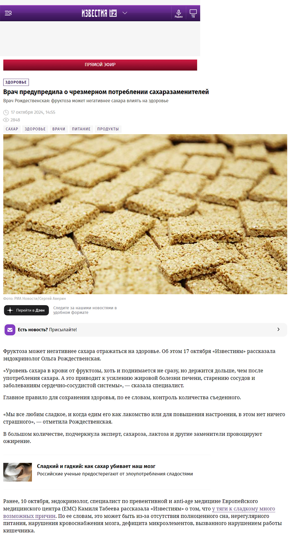 Врач предупредила о чрезмерном потреблении сахарозаменителейДата: 17.10.2024 Источник: Газета Известия Участники: Ольга Рождественская Продолжительность: 00:59 вернуться к медиатеке скачать интервью в docx формате скачать интервью в txt формате скачать интервью в pdf формате скачать интервью в mp3 формате ![]() Врач предупредила о чрезмерном потреблении сахарозаменителей. Фруктоза может негативнее сахара отражаться на здоровье. Об этом 17 октября «Известиям» рассказала эндокринолог Ольга Рождественская. «Уровень сахара в крови от фруктозы, хоть и поднимается не сразу, но держится дольше, чем после употребления сахара. А это приводит к усилению жировой болезни печени, старению сосудов и заболеваниям сердечно-сосудистой системы», — сказала специалист. Главное правило для сохранения здоровья, по ее словам, контроль количества съеденного. «Мы все любим сладкое, и когда едим его как лакомство или для повышения настроения, в этом нет ничего страшного», — отметила Рождественская. В большом количестве, подчеркнула эксперт, сахароза, лактоза и другие заменители провоцируют ожирение. Источник: https://iz.ru/1776049/2024-10-17/vrach-predupredila-o-chrezmernom-potreblenii-sakharazamenitelei Ключевые теги материала: вред сахарозаменителей , длительное повышение сахара , жировая болезнь печени , заменители сахара ожирение , здоровое питание , инсулиновая нагрузка , контроль потребления сахара , лактоза вред , метаболическое здоровье, мнение эндокринолога , ожирение печени , сахар и сахарозаменители , сахароза вред , сахарозаменители , сердечно сосудистые заболевания , скачки сахара , старение сосудов , умеренное потребление сладкого , уровень сахара в крови , фруктоза , фруктоза вред , фруктоза хуже сахара , |