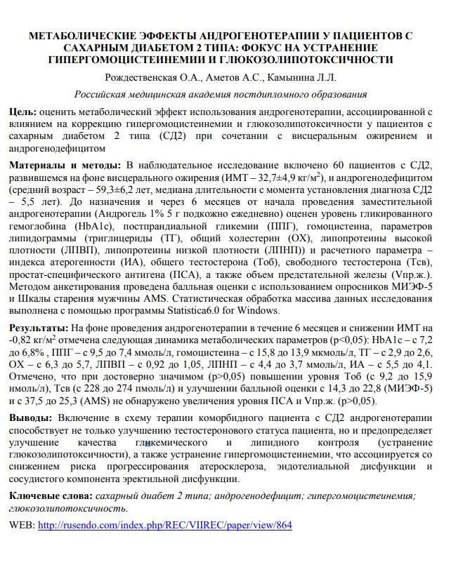 МЕТАБОЛИЧЕСКИЕ ЭФФЕКТЫ АНДРОГЕНОТЕРАПИИ У ПАЦИЕНТОВ С САХАРНЫМ ДИАБЕТОМ 2 ТИПА: ФОКУС НА УСТРАНЕНИЕ ГИПЕРГОМОЦИСТЕИНЕМИИ И ГЛЮКОЗОЛИПОТОКСИЧНОСТИДата: 23.08.2016 Источник: сборник тезисов VII Всероссийского конгресса эндокринологов. ФГБУ "Эндокринологический научный центр" Участники: РОЖДЕСТВЕНСКАЯ О.А., АМЕТОВ А.С., КАМЫНИНА Л.Л. вернуться к медиатеке скачать интервью в txt формате скачать интервью в pdf формате ![]() Цель: оценить метаболический эффект использования андрогенотерапии, ассоциированной с влиянием на коррекцию гипергомоцистеинемии и глюкозолипотоксичности у пациентов с сахарным диабетом 2 типа (СД2) при сочетании с висцеральным ожирением и андрогенодефицитом Материалы и методы: В наблюдательное исследование включено 60 пациентов с СД2, развившемся на фоне висцерального ожирения (ИМТ – 32,7±4,9 кг/м2), и андрогенодефицитом (средний возраст – 59,3±6,2 лет, медиана длительности с момента установления диагноза СД2 – 5,5 лет). До назначения и через 6 месяцев от начала проведения заместительной андрогенотерапии (Андрогель 1% 5 г подкожно ежедневно) оценен уровень гликированного гемоглобина (HbA1c), постпрандиальной гликемии (ППГ), гомоцистеина, параметров липидограммы (триглицериды (ТГ), общий холестерин (ОХ), липопротеины высокой плотности (ЛПВП), липопротеины низкой плотности (ЛПНП)) и расчетного параметра – индекса атерогенности (ИА), общего тестостерона (Тоб), свободного тестостерона (Тсв), простат-специфического антигена (ПСА), а также объем предстательной железы (Vпр.ж.). Методом анкетирования проведена балльная оценки с использованием опросников МИЭФ-5 и Шкалы старения мужчины AMS. Статистическая обработка массива данных исследования выполнена с помощью программы Statistica6.0 for Windows. Результаты: На фоне проведения андрогенотерапии в течение 6 месяцев и снижении ИМТ на -0,82 кг/м2 отмечена следующая динамика метаболических параметров (p<0,05): HbA1c – с 7,2 до 6,8% , ППГ – с 9,5 до 7,4 ммоль/л, гомоцистеина – с 15,8 до 13,9 мкмоль/л, ТГ – с 2,9 до 2,6, ОХ – с 6,3 до 5,7, ЛПВП – с 0,92 до 1,05, ЛПНП – с 4,4 до 3,7 ммоль/л, ИА – с 5,5 до 4,1.Отмечено, что при достоверно значимом (p>0,05) повышении уровня Тоб (с 9,2 до 15,9 нмоль/л), Тсв (с 228 до 274 пмоль/л) и улучшении балльной оценки с 14,3 до 22,8 (МИЭФ-5) и с 37,5 до 25,3 (AMS) не обнаружено увеличения уровня ПСА и Vпр.ж. (p>0,05). Выводы: Включение в схему терапии коморбидного пациента с СД2 андрогенотерапии способствует не только улучшению тестостеронового статуса пациента, но и предопределяет улучшение качества гликемического и липидного контроля (устранение глюкозолипотоксичности), а также устранение гипергомоцистеинемии, что ассоциируется со снижением риска прогрессирования атеросклероза, эндотелиальной дисфункции и сосудистого компонента эректильной дисфункции. |