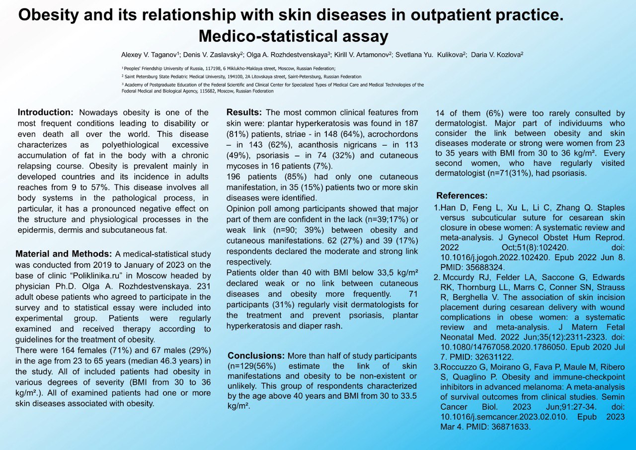 Obesity and its relationship with skin diseases in outpatient practice. Medico-statistical assayДата: 18.05.2023 Источник: 18-й весенний симпозиум Европейской академии дерматологии и венерологии Участники: Taganov A.V., Zaslavsky D.V., Rozhdestvenskaya Olga, Artamonov K.V., Kulikova Svetlana, Kozlova D.V. вернуться к медиатеке скачать интервью в txt формате ![]() Ожирение и его связь с кожными заболеваниями в амбулаторной практике. Медико-статистический анализ Алексей В. Таганов; Денис В. Заславский; Ольга А. Рождественская; Кирилл В. Артамонов; Светлана Ю. Куликова; Дарья В. Козлова Введение: В настоящее время ожирение является одним из наиболее частых состояний, приводящих к инвалидности или даже смерти во всем мире. Это заболевание характеризуется как полиэтиологическое избыточное накопление жира в организме с хроническим рецидивирующим течением. Ожирение распространено преимущественно в развитых странах, а его заболеваемость среди взрослых достигает от 9 до 57%. Это заболевание вовлекает в патологический процесс все системы организма, в частности, оказывает выраженное негативное влияние на структуру и физиологические процессы в эпидермисе, дерме и подкожно-жировой клетчатке. Материалы и методы: Медико-статистическое исследование проводилось с 2019 по январь 2023 года на базе клиники Poliklinika.ru в Москве под руководством врача, д.м.н. Ольги Александровны Рождественской. В экспериментальную группу вошли 231 взрослый пациент с ожирением, согласившийся на участие в опросе и статистическом исследовании. Пациенты регулярно обследовались и получали терапию согласно рекомендациям по лечению ожирения. В исследовании приняли участие 164 женщины (71%) и 67 мужчин (29%) в возрасте от 23 до 65 лет (медиана 46,3 года). Все включенные пациенты имели ожирение различной степени тяжести (ИМТ от 30 до 36 кг/м2). Все обследованные пациенты имели одно или несколько заболеваний кожи, связанных с ожирением. Результаты: Наиболее распространенными клиническими признаками со стороны кожи были: гиперкератоз подошв был обнаружен у 187 (81%) пациентов, стрии - у 148 (64%), акрохордоны - у 143 (62%), черный акантоз - у 113 (49%), псориаз - у 74 (32%) и кожные микозы у 16 пациентов (7%). У 196 пациентов (85%) было только одно кожное проявление, у 35 (15%) пациентов были выявлены два или более кожных заболеваний. Опрос среди участников показал, что большинство из них уверены в отсутствии (n=39; 17%) или слабой связи (n=90; 39%) между ожирением и кожными проявлениями. 62 (27%) и 39 (17%) респондентов заявили об умеренной и сильной связи соответственно. Пациенты старше 40 лет с ИМТ ниже 33,5 кг/м2 чаще декларировали слабую или отсутствующую связь между кожными заболеваниями и ожирением. 71 участник (31%) регулярно посещают дерматологов для лечения и профилактики псориаза, подошвенного гиперкератоза и опрелостей. Выводы: Более половины участников исследования (n=129(56%) оценивают связь кожных проявлений и ожирения как несуществующую или маловероятную. Эта группа респондентов характеризуется возрастом старше 40 лет и ИМТ от 30 до 33,5 кг/м2 14 из них (6%) слишком редко консультировались с дерматологом. Большая часть лиц, считающих связь между ожирением и кожными заболеваниями умеренной или сильной, — женщины от 23 до 35 лет с ИМТ от 30 до 36 кг/м2. У каждой второй женщины, регулярно посещавшей дерматолога (n=71(31%)), был псориаз. Obesity and its relationship with skin diseases in outpatient practice.Medico-statistical assay Alexey V. Taganov; Denis V. Zaslavsky; Olga A. Rozhdestvenskaya; Kirill V. Artamonov; Svetlana Yu. Kulikova; Daria V. K