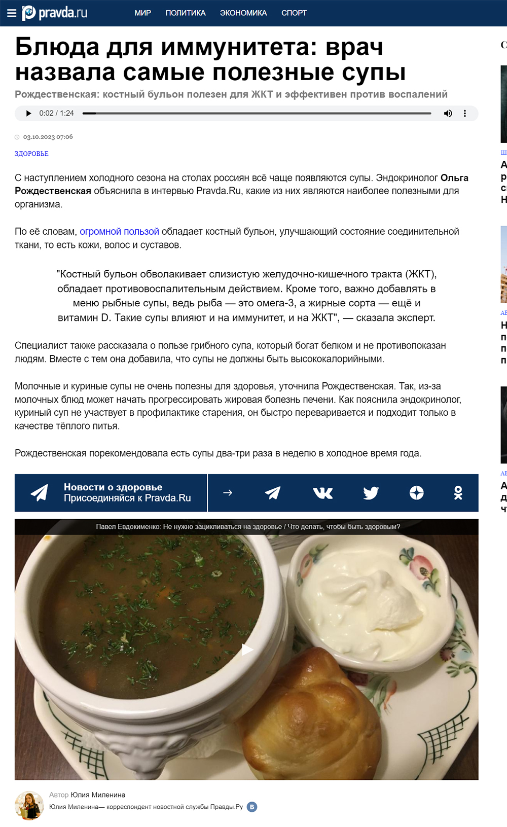 Повышаем иммунитет с помощью самых полезных суповДата: 03.10.2023 Источник: Pravda.Ru Участники: Юлия Миленина, Ольга Рождественская Продолжительность: 1:25 вернуться к медиатеке скачать интервью в txt формате скачать интервью в mp3 формате ![]() Блюда для иммунитета: врач назвала самые полезные супы Рождественская: костный бульон полезен для ЖКТ и эффективен против воспалений С наступлением холодного сезона на столах россиян всё чаще появляются супы. Эндокринолог Ольга Рождественская объяснила в интервью Pravda.Ru, какие из них являются наиболее полезными для организма. По её словам, огромной пользой обладает костный бульон, улучшающий состояние соединительной ткани, то есть кожи, волос и суставов. "Костный бульон обволакивает слизистую желудочно-кишечного тракта (ЖКТ), обладает противовоспалительным действием. Кроме того, важно добавлять в меню рыбные супы, ведь рыба — это омега-3, а жирные сорта — ещё и витамин D. Такие супы влияют и на иммунитет, и на ЖКТ", — сказала эксперт. Специалист также рассказала о пользе грибного супа, который богат белком и не противопоказан людям. Вместе с тем она добавила, что супы не должны быть высококалорийными. Молочные и куриные супы не очень полезны для здоровья, уточнила Рождественская. Так, из-за молочных блюд может начать прогрессировать жировая болезнь печени. Как пояснила эндокринолог, куриный суп не участвует в профилактике старения, он быстро переваривается и подходит только в качестве тёплого питья. Рождественская порекомендовала есть супы два-три раза в неделю в холодное время года. Источник: https://www.pravda.ru/news/health/1892542-bulon_sup/ |