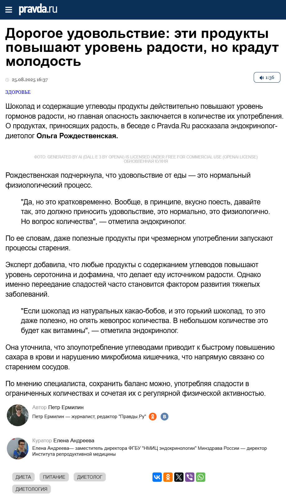 Дорогое удовольствие: эти продукты повышают уровень радости, но крадут молодостьДата: 25.08.2025 Источник: Pravda.Ru Участники: Петр Ермилин, Ольга Рождественская, Елена Андреева Продолжительность: 1:09 вернуться к медиатеке скачать интервью в txt формате скачать интервью в mp3 формате ![]() Шоколад и содержащие углеводы продукты действительно повышают уровень гормонов радости, но главная опасность заключается в количестве их употребления. О продуктах, приносящих радость, в беседе с Pravda.Ru рассказала эндокринолог-диетолог Ольга Рождественская. Рождественская подчеркнула, что удовольствие от еды — это нормальный физиологический процесс. "Да, но это кратковременно. Вообще, в принципе, вкусно поесть, давайте так, это должно приносить удовольствие, это нормально, это физиологично. Но вопрос количества", — отметила эндокринолог. По ее словам, даже полезные продукты при чрезмерном употреблении запускают процессы старения. Эксперт добавила, что любые продукты с содержанием углеводов повышают уровень серотонина и дофамина, что делает еду источником радости. Однако именно переедание сладостей часто становится фактором развития тяжелых заболеваний. "Если шоколад из натуральных какао-бобов, и это горький шоколад, то это даже полезно, но опять жевопрос количества. В небольшом количестве это будет как витамины", — отметила эндокринолог. Она уточнила, что злоупотребление углеводами приводит к быстрому повышению сахара в крови и нарушению микробиома кишечника, что напрямую связано со старением сосудов. По мнению специалиста, сохранить баланс можно, употребляя сладости в ограниченных количествах и сочетая их с регулярной физической активностью. Источник: https://www.pravda.ru/news/health/2266134-radost/ Ключевые теги материала: баланс питания , гормоны радости , горький шоколад , дофамин , злоупотребление углеводами , количество употребления , микробиом кишечника , натуральные какао бобы , ограниченное употребление , переедание , повышение сахара в крови , полезные продукты , продукты, приносящие радость , процессы старения , серотонин , сладости , старение сосудов , тяжелые заболевания , углеводы , удовольствие от еды , уровень сахара в крови , физиологический процесс , физическая активность, чрезмерное употребление , шоколад , |