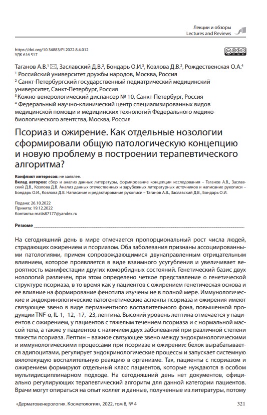 Псориаз и ожирение. Как отдельные нозологии сформировали общую патологическую концепцию и новую проблему в построении терапевтического алгоритма?Дата: 19.12.2022 Источник: журнал «Дерматовенерология. Косметология» том 8 № 4 Участники: Таганов А.В., Заславский Д.В., Бондарь О.И., Козлова Д.В., Рождественская О.А вернуться к медиатеке скачать интервью в txt формате скачать интервью в pdf формате ![]() ![]() На сегодняшний день в мире отмечается пропорциональный рост числа людей, страдающих ожирением и псориазом. Оба заболевания признаны ассоциированными патологиями, причем сопровождающимися двунаправленным отрицательным влиянием, которое проявляется в виде взаимного усугубления и увеличивает вероятность манифестации других коморбидных состояний. Генетический базис двух нозологий различен, при этом определено четкое представление о генетической структуре псориаза, в то время как у пациентов с ожирением генетическая основа и ее влияние на формирование фенотипа изучены не в полной мере. Иммунологические и эндокринологические патогенетические аспекты псориаза и ожирения имеют связующее звено в виде перманентного воспалительного фона, повышенной продукции TNF-α, IL-1, -12, -17, -23, лептина. Высокий уровень лептина отмечается у пациентов с ожирением, у пациентов с тяжелым течением псориаза и с нормальной массой тела, а также у пациентов с наличием двух заболеваний при различной степени тяжести псориаза. Лептин – важное связующее звено между эндокринологическими и иммунологическими процессами при псориазе и ожирении: белок вырабатывается адипоцитами, регулирует эндокринологические процессы и запускает системную вялотекущую воспалительную реакцию в организме. Так, пациенты с псориазом и ожирением формируют отдельный класс пациентов, которые нуждаются в особом мультидисциплинарном подходе. На сегодняшний день нет документов, официально регулирующих терапевтический алгоритм для данной категории пациентов. Врачи могут опираться на опыт коллег и данные, полученные из литературы, потому для практикующих специалистов доступность систематизированных данных очень важна. Классические методы борьбы с псориазом – топическая терапия и базовая системная терапия – имеют ряд ограничений. Даже самые современные генно-инженерные биологические препараты бывают недостаточно эффективными у пациентов данной категории, поэтому нормализация веса и снижение жировой массы – чрезвычайно важная цель в рамках курации пациентов с псориазом и ожирением. Источник: https://doi.org/10.34883/PI.2022.8.4.012 |