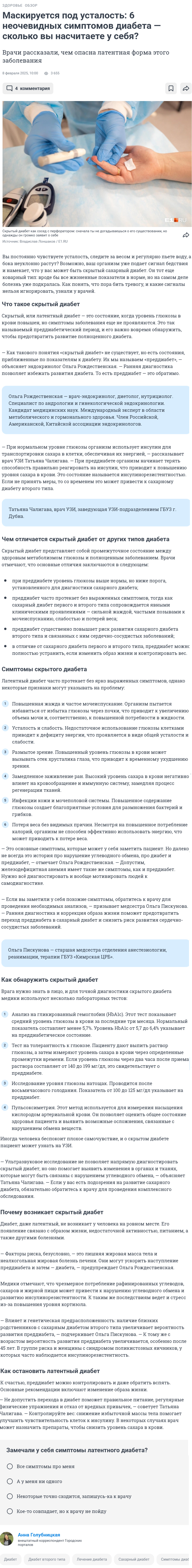 Шесть неочевидных симптомов диабетаДата: 08.02.2025 Источник: Городские порталы Участники: Анна Голубницкая, Ольга Рождественская, Татьяна Чалигава, Ольга Пискунова вернуться к медиатеке скачать интервью в txt формате ![]() Маскируется под усталость: 6 неочевидных симптомов диабета — сколько вы насчитаете у себя? Врачи рассказали, чем опасна латентная форма этого заболевания Вы постоянно чувствуете усталость, следите за весом и регулярно пьете воду, а бока неуклонно растут? Возможно, ваш организм уже подает сигнал бедствия и намекает, что у вас может быть скрытый сахарный диабет. Он тот еще коварный тип: вроде бы все жизненные показатели в норме, но на самом деле болезнь уже подкралась. Как понять, что пора бить тревогу, и какие сигналы нельзя игнорировать, узнали у врачей. Что такое скрытый диабет Скрытый, или латентный диабет — это состояние, когда уровень глюкозы в крови повышен, но симптомы заболевания еще не проявляются. Это так называемый преддиабетический период, и его важно вовремя обнаружить, чтобы предотвратить развитие полноценного диабета. — Как такового понятия «скрытый диабет» не существует, но есть состояния, приближенные по показателям к диабету. Их мы называем «преддиабет», — объясняет эндокринолог Ольга Рождественская. — Ранняя диагностика позволяет избежать развития диабета. То есть преддиабет — это обратимо. — При нормальном уровне глюкозы организм использует инсулин для транспортировки сахара в клетки, обеспечивая их энергией, — рассказывает врач УЗИ Татьяна Чалигава. — При преддиабете организм начинает терять способность правильно реагировать на инсулин, что приводит к повышению уровня сахара в крови. Это состояние называется инсулинорезистентностью. Если не принять меры, то со временем это может привести к сахарному диабету второго типа. Чем отличается скрытый диабет от других типов диабета Скрытый диабет представляет собой промежуточное состояние между здоровым метаболизмом глюкозы и полноценным заболеванием. Врачи отмечают, что основные отличия заключаются в следующем: Симптомы скрытого диабета Латентный диабет часто протекает без ярко выраженных симптомов, однако некоторые признаки могут указывать на проблему: — Это основные симптомы, которые может у себя заметить пациент. Но далеко не всегда это история про нарушение углеводного обмена, про диабет и преддиабет, — отмечает Ольга Рождественская. — Допустим, железодефицитная анемия имеет такие же симптомы, как и преддиабет. Нужно всё диагностировать и вообще мотивировать людей к самодиагностике. — Если вы заметили у себя похожие симптомы, обратитесь к врачу для проведения необходимых анализов, — призывает медсестра Ольга Пискунова. — Ранняя диагностика и коррекция образа жизни поможет предотвратить переход преддиабета в сахарный диабет и снизить риск развития сердечно-сосудистых заболеваний. Как обнаружить скрытый диабет Врага нужно знать в лицо, и для точной диагностики скрытого диабета медики используют несколько лабораторных тестов: Иногда человека беспокоит плохое самочувствие, и о скрытом диабете пациент может узнать на УЗИ. — Ультразвуковое исследование не позволяет напрямую диагностировать скрытый диабет, но оно помогает выявить изменения в органах и тканях, которые могут быть связаны с нарушением углеводного обмена, 