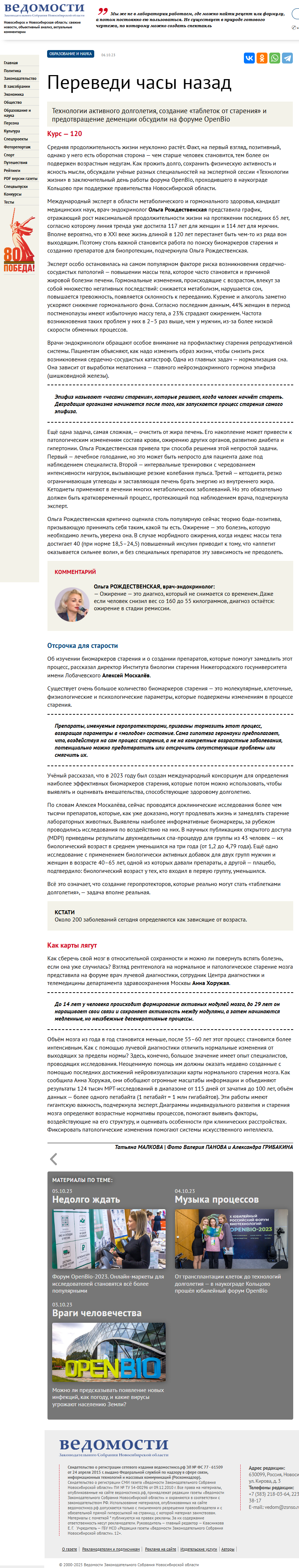 Средняя продолжительность жизни неуклонно растёт.Дата: 06.10.2023 Источник: Ведомости Законодательного Собрания Новосибирской области Участники: Татьяна МАЛКОВА, Рождественская Ольга Анатольевна, Алексей Москалёв, Анна Хоружая вернуться к медиатеке скачать интервью в txt формате ![]() Средняя продолжительность жизни неуклонно растёт. Факт, на первый взгляд, позитивный, однако у него есть оборотная сторона — чем старше человек становится, тем более он подвержен возрастным недугам. Как прожить долго, сохранить физическую активность и ясность мысли, обсуждали учёные разных специальностей на экспертной сессии «Технологии жизни» в заключительный день работы форума OpenBio, проходившего в наукограде Кольцово при поддержке правительства Новосибирской области. Международный эксперт в области метаболического и гормонального здоровья, кандидат медицинских наук, врач-эндокринолог Ольга Рождественская представила график, отражающий рост максимальной продолжительности жизни на протяжении последних 65 лет, согласно которому линия тренда уже достигла 117 лет для женщин и 114 лет для мужчин. Вполне вероятно, что в XXI веке жизнь длиной в 120 лет перестанет быть чем-то из ряда вон выходящим. Поэтому столь важной становится работа по поиску биомаркеров старения и созданию препаратов для биопротекции, подчеркнула Ольга Рождественская. Эксперт особо остановилась на самом популярном факторе риска возникновения сердечно-сосудистых патологий — повышении массы тела, которое часто становится и причиной жировой болезни печени. Гормональные изменения, происходящие с возрастом, влекут за собой множество негативных последствий: снижается метаболизм, нарушается сон, повышается тревожность, появляется склонность к перееданию. Курение и алкоголь заметно ускоряют снижение гормонального фона. Согласно последним данным, 44% женщин в период постменопаузы имеют избыточную массу тела, а 23% страдают ожирением. Частота возникновения таких проблем у них в 2–5 раз выше, чем у мужчин, из-за более низкой скорости обменных процессов. Врачи-эндокринологи обращают особое внимание на профилактику старения репродуктивной системы. Пациентам объясняют, как надо изменить образ жизни, чтобы снизить риск возникновения сердечно-сосудистых катастроф. Одна из главных задач — нормализация сна. Она зависит от выработки мелатонина — главного нейроэндокринного гормона эпифиза (шишковидной железы). Эпифиз называют «часами старения», которые решают, когда человек начнёт стареть. Деградация организма начинается после того, как запускается процесс старения самого эпифиза. Ещё одна задача, самая сложная, — очистить от жира печень. Его накопление может привести к патологическим изменениям состава крови, ожирению других органов, развитию диабета и гипертонии. Ольга Рождественская привела три способа решения этой непростой задачи. Первый — лечебное голодание, но это может быть непросто для пациента даже под наблюдением специалиста. Второй — интервальные тренировки с чередованием интенсивности нагрузок, вызывающие резкие колебания пульса. Третий — кетодиета, резко ограничивающая углеводы и заставляющая печень брать энергию из внутреннего жира. Кетодиеты применяют в лечении многих метаболических заболеваний. Но это обязательно должен быть кратковременный процесс, протек