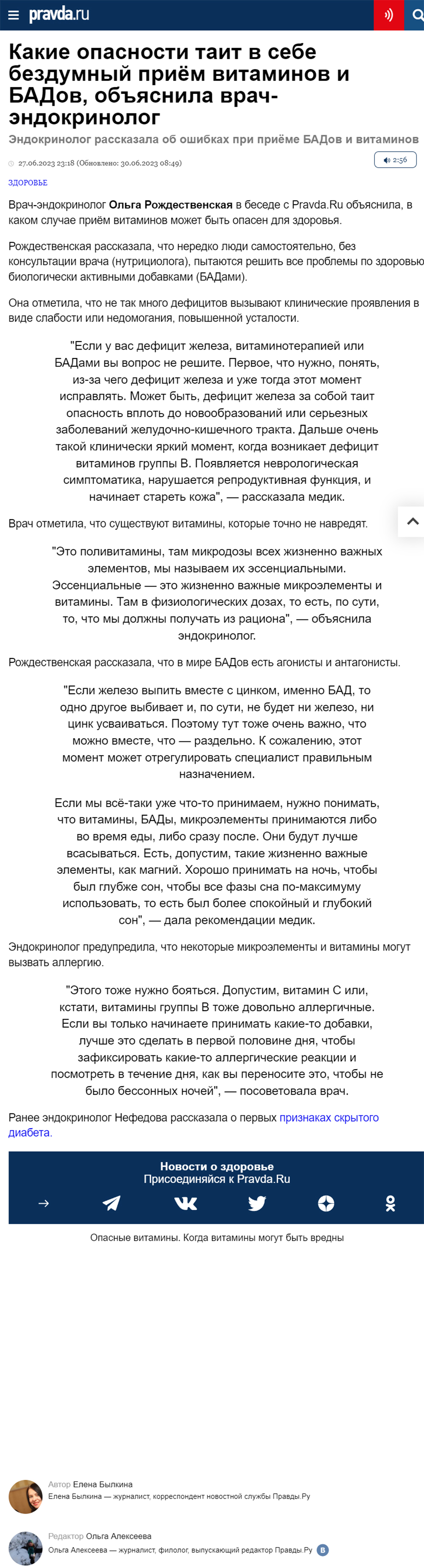 Врач-эндокринолог об опасности бездумного приёма витаминов и БАДовДата: 27.06.2023 Источник: Pravda.Ru Участники: Елена Былкина, Ольга Рождественская Продолжительность: 3:22 вернуться к медиатеке скачать интервью в docx формате скачать интервью в txt формате скачать интервью в pdf формате скачать интервью в mp3 формате ![]() Какие опасности таит в себе бездумный приём витаминов и БАДов, объяснила врач-эндокринолог Эндокринолог рассказала об ошибках при приёме БАДов и витаминов Врач-эндокринолог Ольга Рождественская в беседе с Pravda.Ru объяснила, в каком случае приём витаминов может быть опасен для здоровья. Рождественская рассказала, что нередко люди самостоятельно, без консультации врача (нутрициолога), пытаются решить все проблемы по здоровью биологически активными добавками (БАДами). Она отметила, что не так много дефицитов вызывают клинические проявления в виде слабости или недомогания, повышенной усталости. "Если у вас дефицит железа, витаминотерапией или БАДами вы вопрос не решите. Первое, что нужно, понять, из-за чего дефицит железа и уже тогда этот момент исправлять. Может быть, дефицит железа за собой таит опасность вплоть до новообразований или серьезных заболеваний желудочно-кишечного тракта. Дальше очень такой клинически яркий момент, когда возникает дефицит витаминов группы B. Появляется неврологическая симптоматика, нарушается репродуктивная функция, и начинает стареть кожа", — рассказала медик. Врач отметила, что существуют витамины, которые точно не навредят. "Это поливитамины, там микродозы всех жизненно важных элементов, мы называем их эссенциальными. Эссенциальные — это жизненно важные микроэлементы и витамины. Там в физиологических дозах, то есть, по сути, то, что мы должны получать из рациона", — объяснила эндокринолог. Рождественская рассказала, что в мире БАДов есть агонисты и антагонисты. "Если железо выпить вместе с цинком, именно БАД, то одно другое выбивает и, по сути, не будет ни железо, ни цинк усваиваться. Поэтому тут тоже очень важно, что можно вместе, что — раздельно. К сожалению, этот момент может отрегулировать специалист правильным назначением. Если мы всё-таки уже что-то принимаем, нужно понимать, что витамины, БАДы, микроэлементы принимаются либо во время еды, либо сразу после. Они будут лучше всасываться. Есть, допустим, такие жизненно важные элементы, как магний. Хорошо принимать на ночь, чтобы был глубже сон, чтобы все фазы сна по-максимуму использовать, то есть был более спокойный и глубокий сон", — дала рекомендации медик. Эндокринолог предупредила, что некоторые микроэлементы и витамины могут вызвать аллергию. "Этого тоже нужно бояться. Допустим, витамин С или, кстати, витамины группы В тоже довольно аллергичные. Если вы только начинаете принимать какие-то добавки, лучше это сделать в первой половине дня, чтобы зафиксировать какие-то аллергические реакции и посмотреть в течение дня, как вы переносите это, чтобы не было бессонных ночей", — посоветовала врач. Ранее эндокринолог Нефедова рассказала о первых признаках скрытого диабета. Источник: https://www.pravda.ru/news/health/1851872-priem_vitaminov/ |