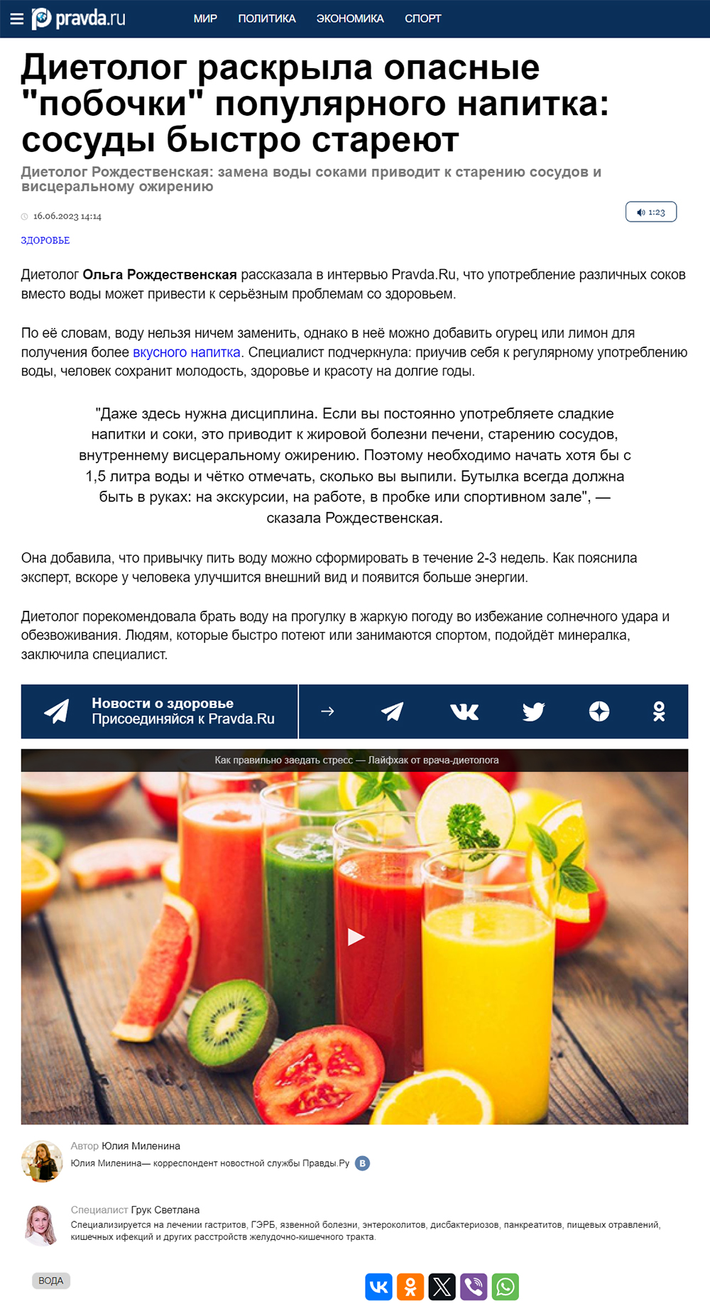 Диетолог Рождественская: замена воды соками приводит к старению сосудов и висцеральному ожирениюДата: 16.06.2023 Источник: Pravda.Ru Участники: Юлия Миленина, Ольга Рождественская Продолжительность: 1:23 вернуться к медиатеке скачать интервью в docx формате скачать интервью в txt формате скачать интервью в pdf формате скачать интервью в mp3 формате ![]() Диетолог раскрыла опасные "побочки" популярного напитка: сосуды быстро стареют Диетолог Рождественская: замена воды соками приводит к старению сосудов и висцеральному ожирению Диетолог Ольга Рождественская рассказала в интервью Pravda.Ru, что употребление различных соков вместо воды может привести к серьёзным проблемам со здоровьем. По её словам, воду нельзя ничем заменить, однако в неё можно добавить огурец или лимон для получения более вкусного напитка. Специалист подчеркнула: приучив себя к регулярному употреблению воды, человек сохранит молодость, здоровье и красоту на долгие годы. "Даже здесь нужна дисциплина. Если вы постоянно употребляете сладкие напитки и соки, это приводит к жировой болезни печени, старению сосудов, внутреннему висцеральному ожирению. Поэтому необходимо начать хотя бы с 1,5 литра воды и чётко отмечать, сколько вы выпили. Бутылка всегда должна быть в руках: на экскурсии, на работе, в пробке или спортивном зале", — сказала Рождественская. Она добавила, что привычку пить воду можно сформировать в течение 2-3 недель. Как пояснила эксперт, вскоре у человека улучшится внешний вид и появится больше энергии. Диетолог порекомендовала брать воду на прогулку в жаркую погоду во избежание солнечного удара и обезвоживания. Людям, которые быстро потеют или занимаются спортом, подойдёт минералка, заключила специалист. Источник: https://www.pravda.ru/news/health/1847299-dietologija_sok/ |